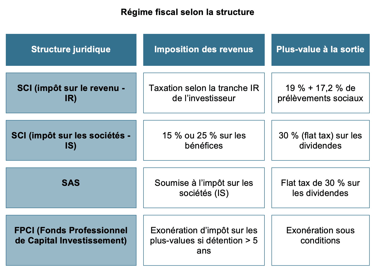 L’investissement passe par une société civile immobilière (SCI), une SAS ou un FPCI, permettant d'optimiser les aspects juridique et fiscale.