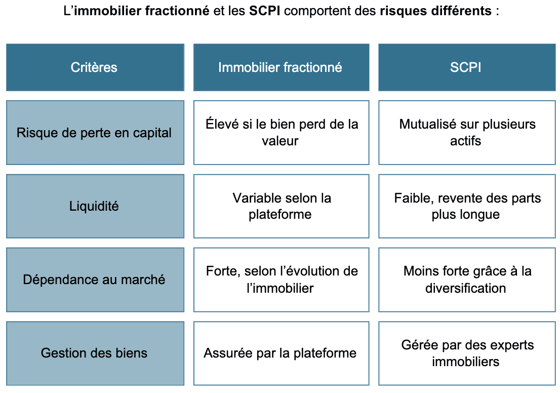 Si vous avez un petit capital et souhaitez tester l’immobilier, l’immobilier fractionné est une bonne porte d’entrée. Si vous recherchez un revenu stable et passif, les SCPI sont plus adaptées.