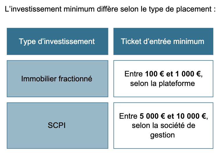 ⭕ Un ticket d’entrée plus élevé : La plupart des SCPI exigent un investissement minimum de 5 000 à 10 000 €.