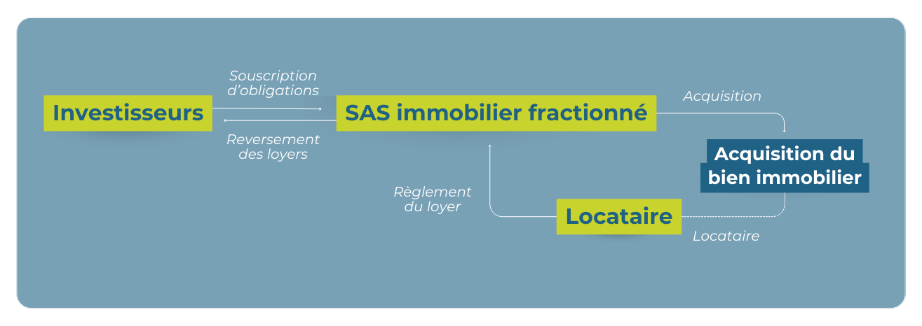 L'investisseur souscrit à des obligations d'une société, qui acquiert le local commercial. Le locataire paye ses loyers, qui sont ensuite redistribués aux investisseurs. C'est simple.