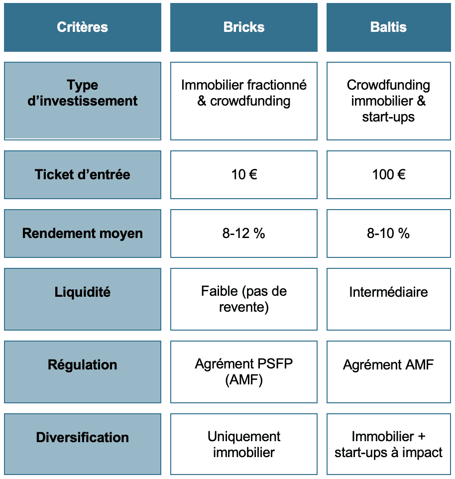 Bricks et Baltis sont deux plateformes de crowdfunding immobilier, mais elles présentent des différences importantes.